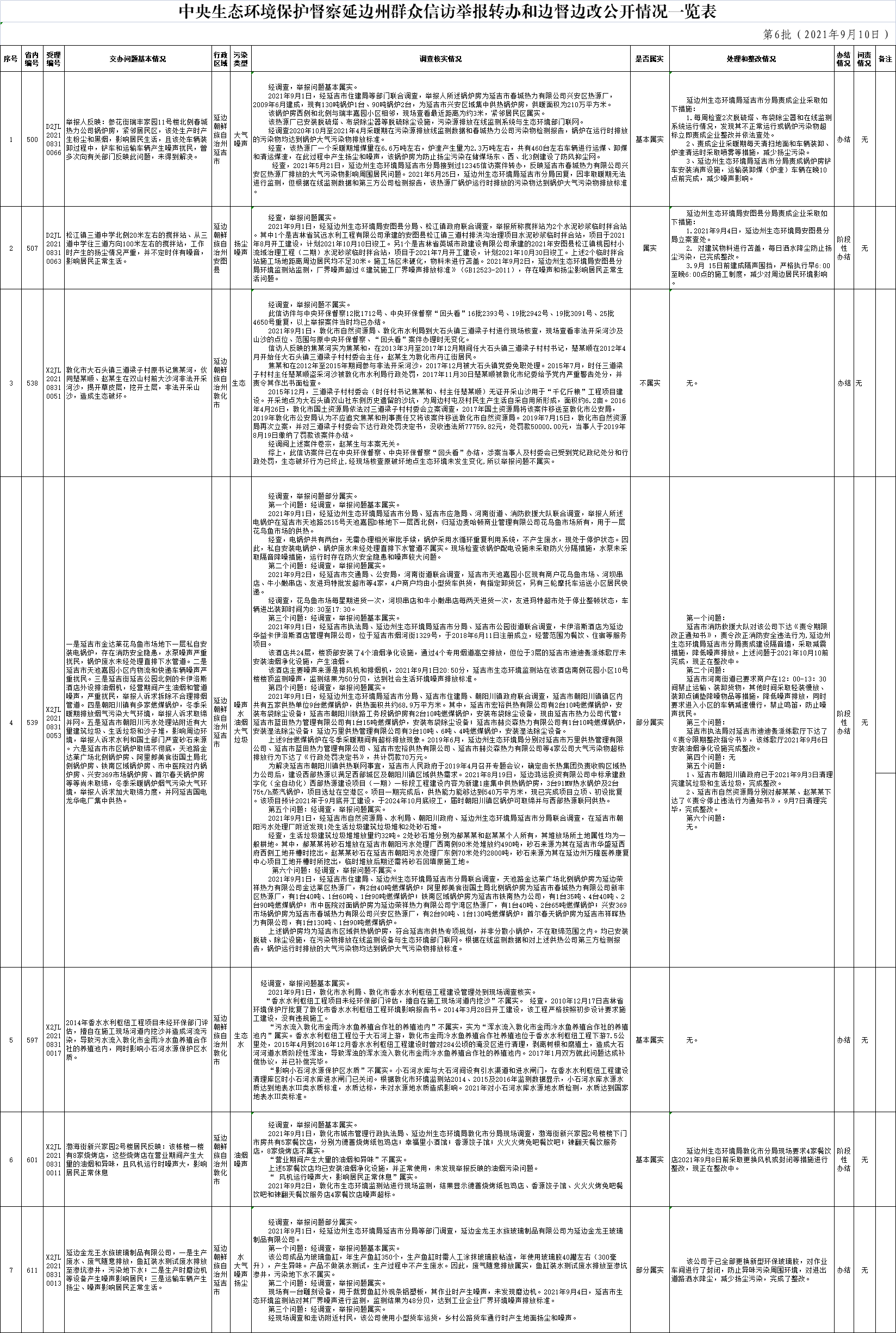 中央生态环境保护督察延边州群众信访举报转办和边督边改公开情况一览表(第6批9月10日)